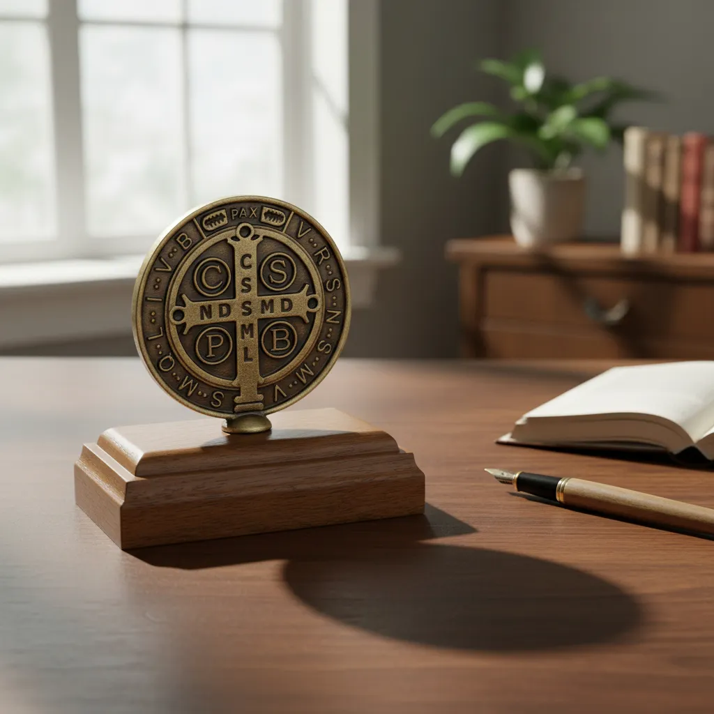Leve proteção, fé e elegância para o seu lar ou ambiente de trabalho com este lindo adorno de mesa com a tradicional Medalha de São Bento. Produzido em madeira imbuia de alta qualidade e medalha em metal com acabamento ouro velho, é uma peça resistente, sofisticada e cheia de significado espiritual.