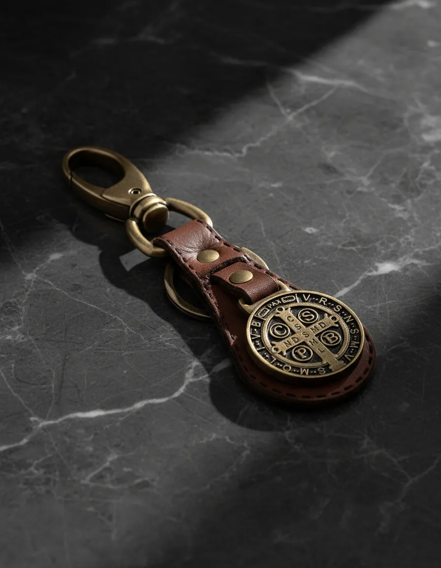 Produzido em couro de alta qualidade, com costura reforçada, o chaveiro conta com medalha de São Bento em metal na cor ouro velho, conferindo um visual clássico e atemporal. O mosquetão metálico garante praticidade e segurança para prender as chaves, bolsas ou mochilas.
