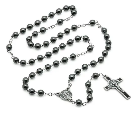 Colar Terço Hematita 6mm Inox com Cruz São Bento