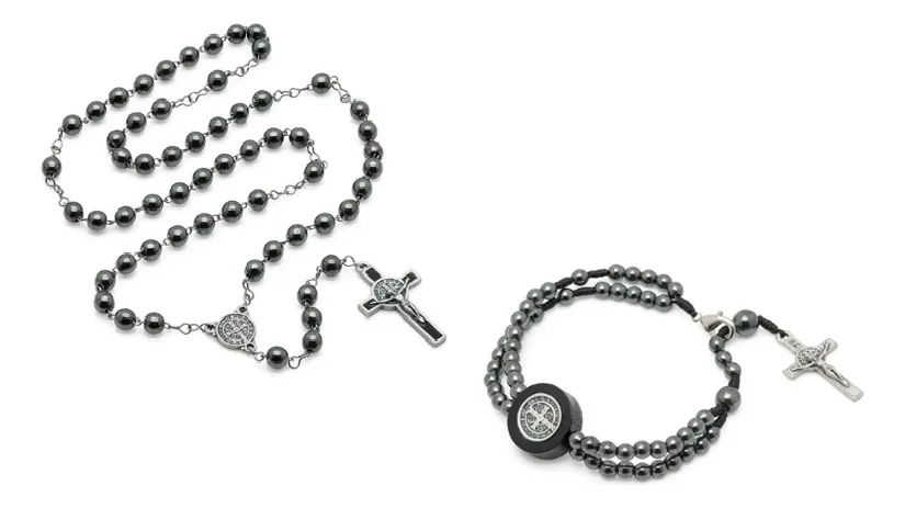 Conjunto de Colar Terço Hematita 6mm Inox com Cruz São Bento e Pulseira Terço São Bento com Crucifixo