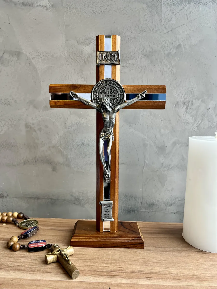 Crucifixo Madeira Frisada 26cm São Bento Espelhado Mesa Parede