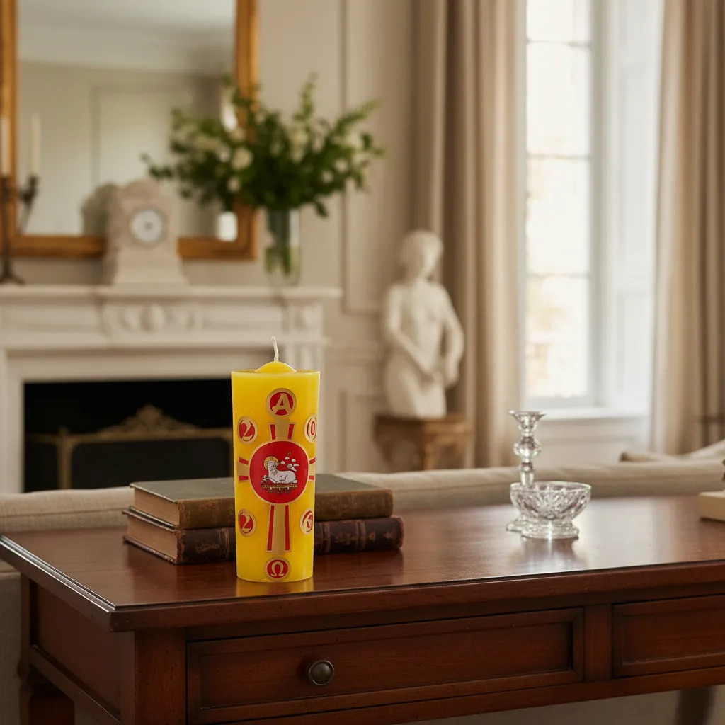 Vela círio pascal confeccionada em parafina amarela, com detalhes em vermelho e dourado, representando o Cordeiro de Deus (Agnus Dei), símbolo da ressurreição e da luz de Cristo.