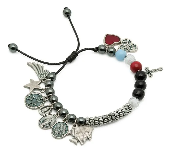 Pulseira regulável de cordão encerado, com contas em hematita e nas cores preto, branco, azul e vermelho e pingentes referentes à história de Jesus. Acompanha folheto com o significado de cada pingente. Ajustável para pulsos de 15 cm a 18 cm (comprimento).