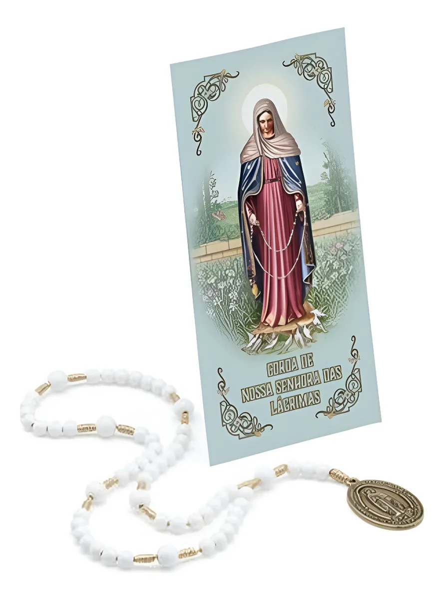 Lindo Terço Coroa de Nossa Senhora das Lágrimas, confeccionado com contas brancas, que simbolizam pureza, fé e devoção. Um item especial para momentos de oração, meditação e pedido de intercessão, muito utilizado na devoção mariana.