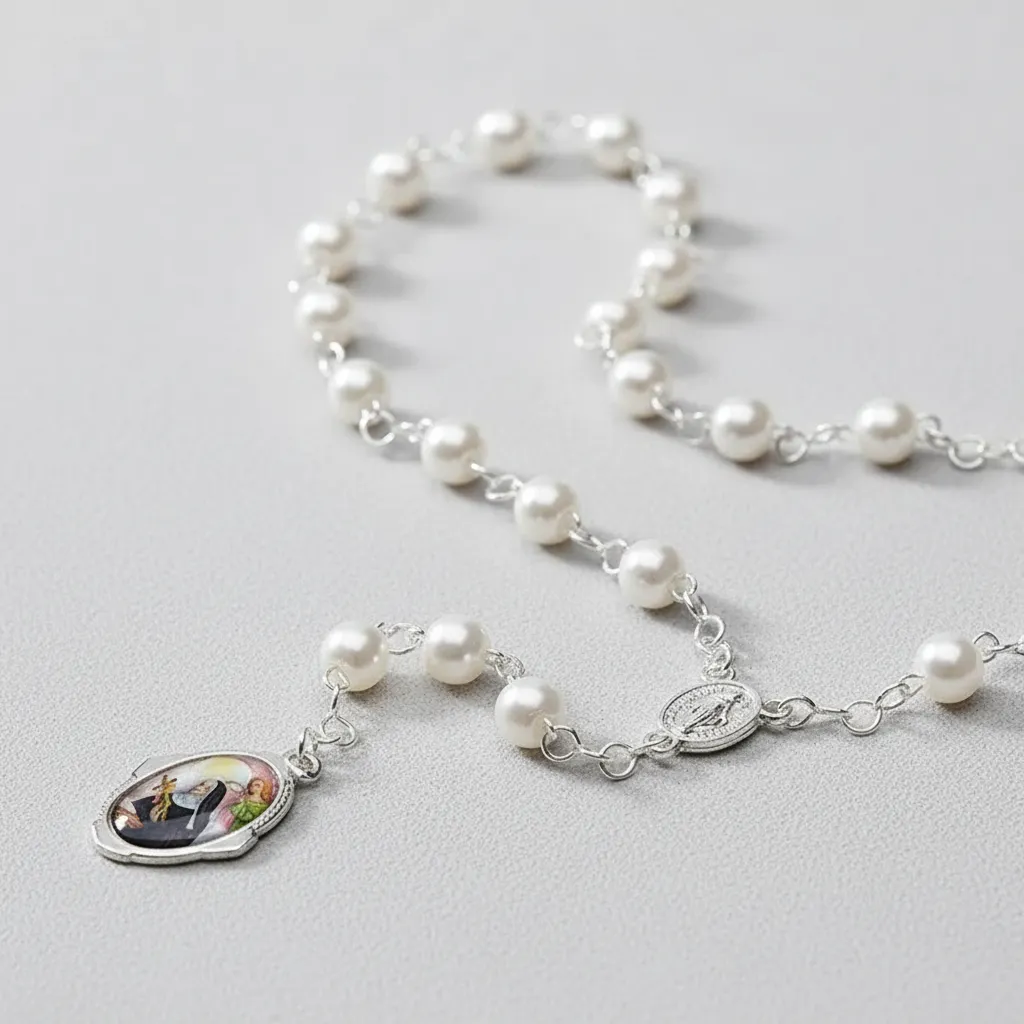 Terço Coroa de Santa Rita de Cássia com Folheto de Oração – Contas Pérola 6mm