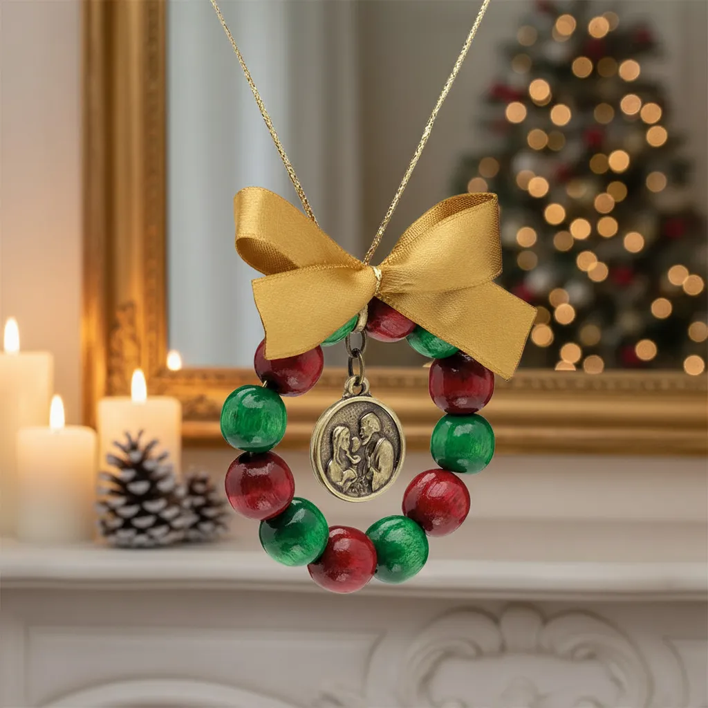 Adorne sua árvore com um toque de fé e beleza! Esta delicada guirlanda natalina é feita com contas em madeira nas cores tradicionais do Natal (vermelho e verde), formando um enfeite encantador e cheio de significado.
