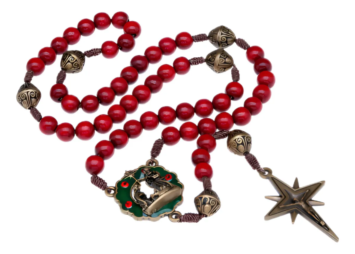 Lindo Terço de Natal 8mm Vermelho-Guirlanda, confeccionado em cordão, com contas em Vermelho, metais na cor ouro velho.