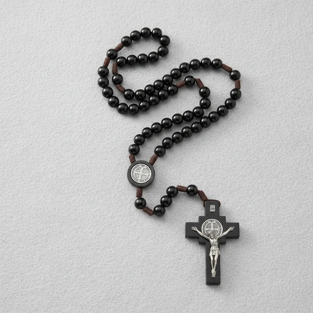 Lindo terço confeccionado em madeira preta, com contas de 10mm, que transmite sobriedade, fé e devoção. Possui Medalha de São Bento, símbolo tradicional de proteção espiritual, e cordão marrom resistente, ideal para uso diário ou para presentear.